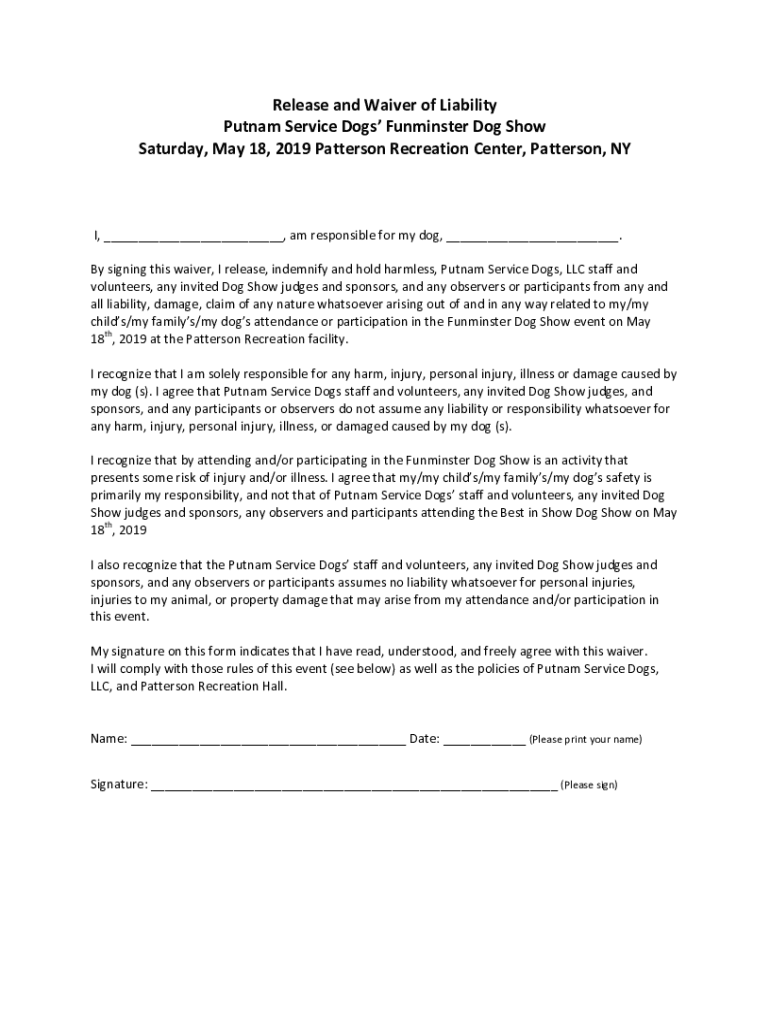 ReleaseandWaiverofLiability PutnamServiceDogsFunminsterDogShow Saturday,May18,2019PattersonRecreationCenter,Patterson,NY I,___,amresponsibleformydog,___. Bysigningthiswaiver,Irelease,indemnifyandholdharmless,PutnamServiceDogs,LLCstaffand