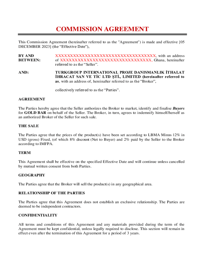 COMMISSION AGREEMENT This Commission Agreement (hereinafter referred to as the \"Agreement\") is made and effective [05 DECEMBER 2023] (the Effective Date), BY AND BETWEEN:XXXXXXXXXXXXXXXXXXXXXXXXXXXXXXXXXX,