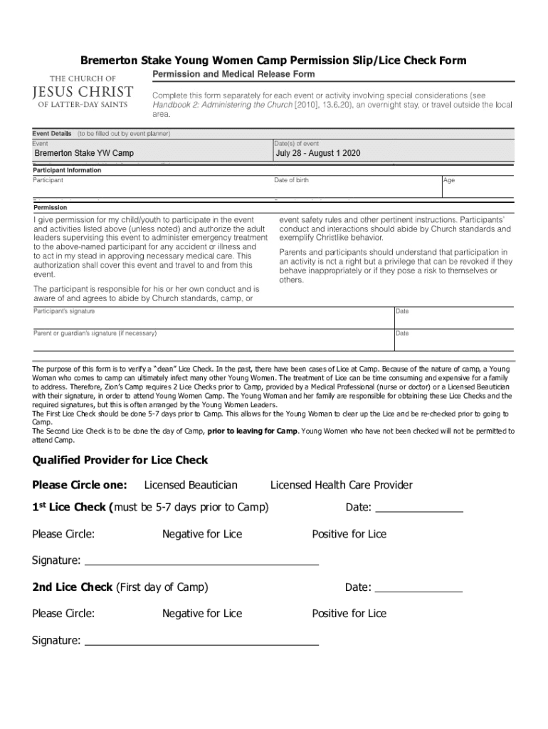 Get the free Bremerton Stake Young Women Camp Permission Slip/Lice Check ...