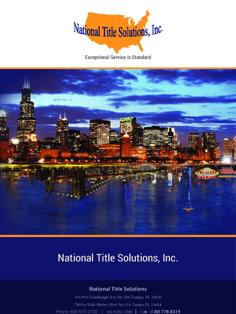 Exceptional Service is StandardNational Title Solutions, Inc. National Title Solutions 13139 w Linebaugh Ave Ste 204 Tampa, FL 33626 7819 n Dale Mabry Hwy Ste 114 Tampa FL 33614 Phone: 800NTS2700