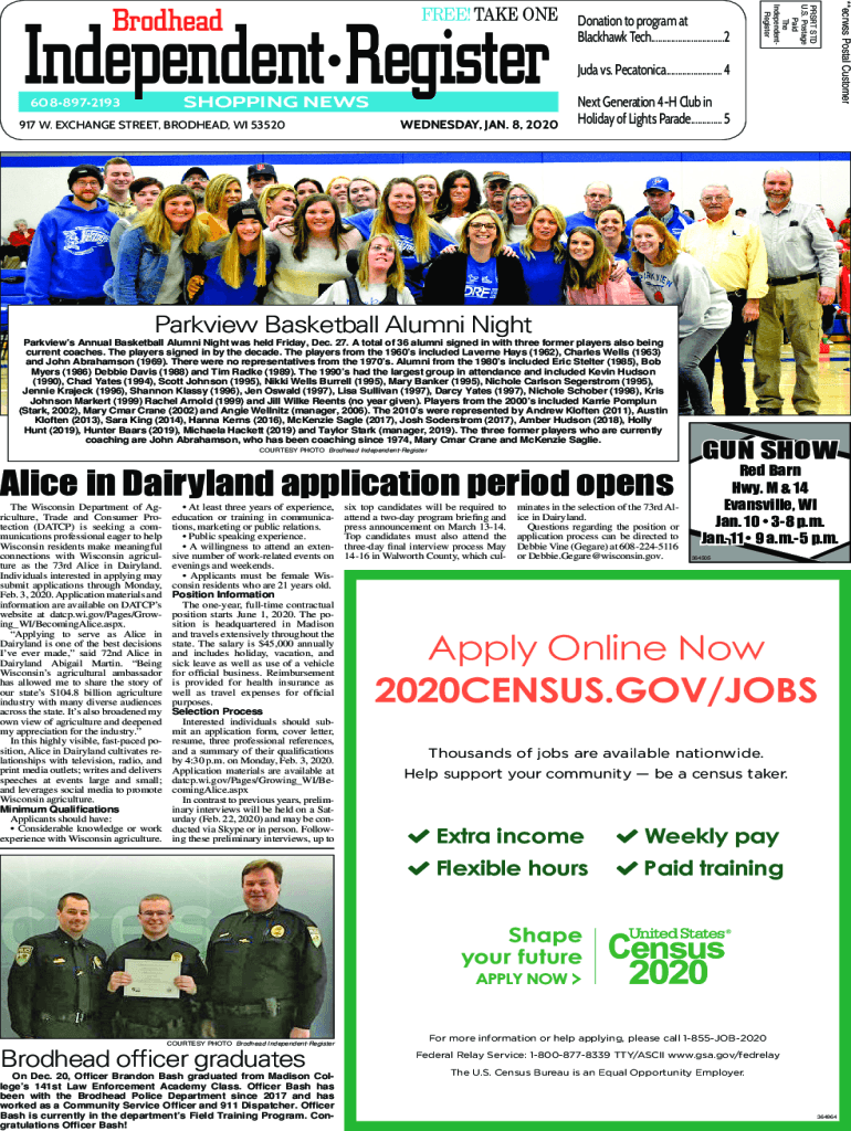Independent Register 6088972193SHOPPING NEWS917 W. EXCHANGE STREET, BRODHEAD, WI 53520WEDNESDAY, JAN. 8, 2020Blackhawk Tech.................................2 Juda vs. Pecatonica..........................