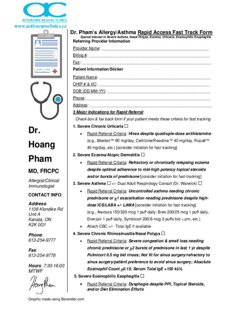Dr. Phams Allergy/Asthma Rapid Access Fast Track Form Special Interest in Severe Asthma, Nasal Polyps, Eczema, Urticaria, Eosinophilic EsophagitisReferring Provider Information Provider Name: ___