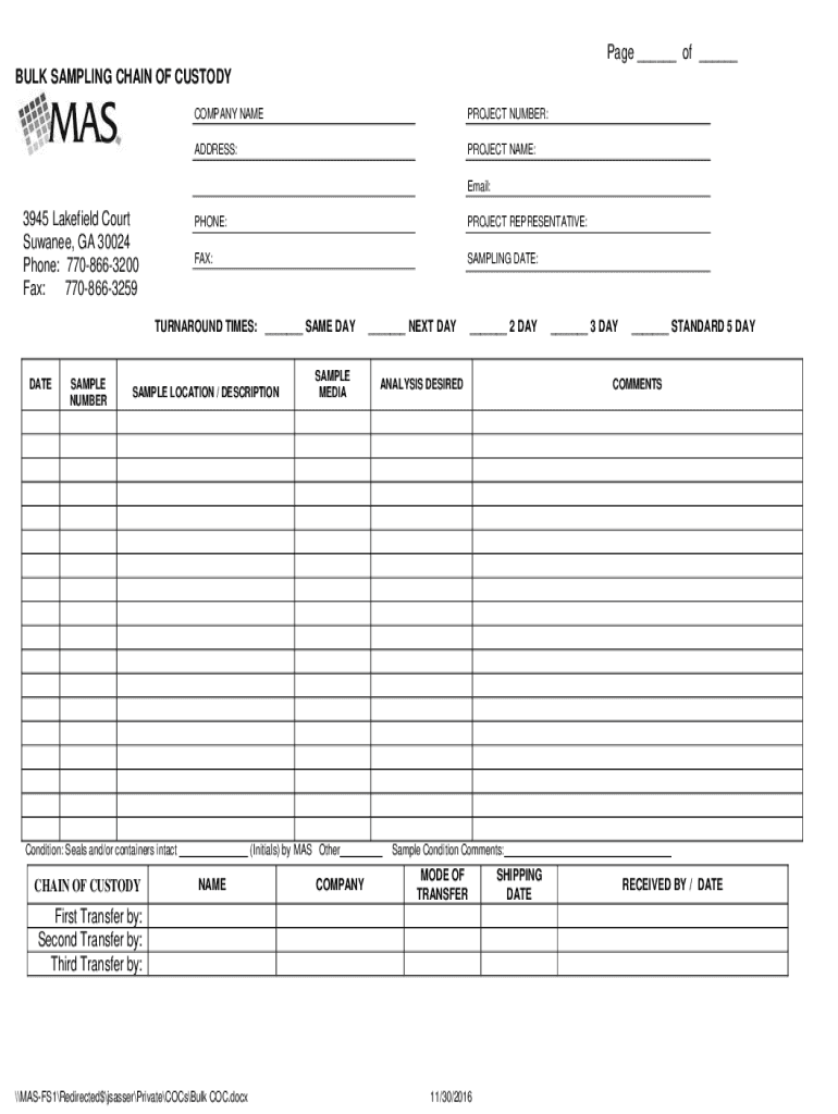 Page ___ of ___ BULK SAMPLING CHAIN OF CUSTODY COMPANY NAMEPROJECT NUMBER:ADDRESS:PROJECT NAME: Email:3945 Lakefield Court Suwanee, GA 30024 Phone: 7708663200 Fax: 7708663259PHONE:PROJECT REPRESENTATIVE:FAX:SAMPLING