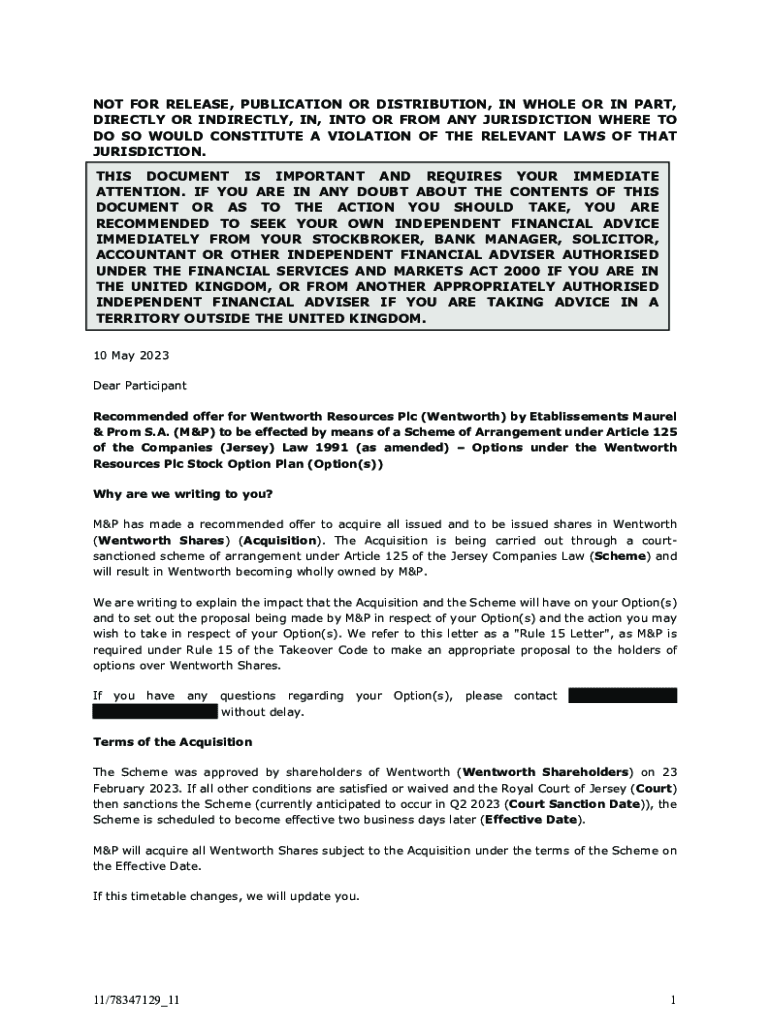 NOT FOR RELEASE, PUBLICATION OR DISTRIBUTION, IN WHOLE OR IN PART, DIRECTLY OR INDIRECTLY, IN, INTO OR FROM ANY JURISDICTION WHERE TO DO SO WOULD CONSTITUTE A VIOLATION OF THE RELEVANT LAWS OF THAT
