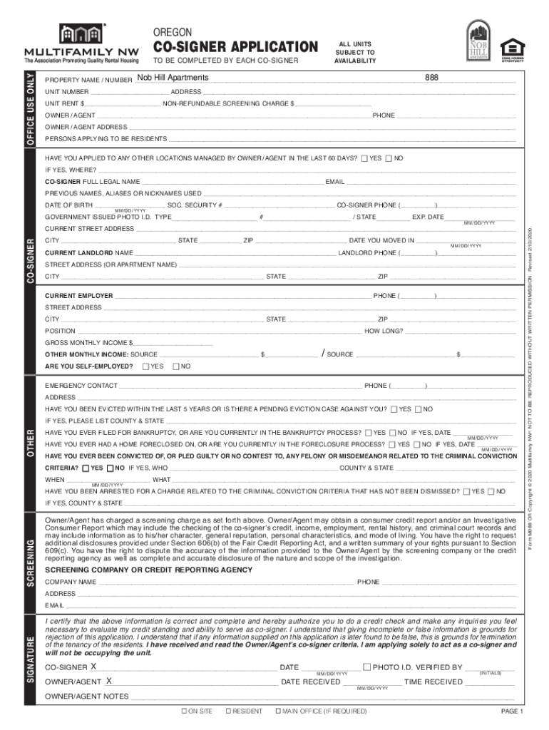 OREGONCOSIGNER APPLICATIONALL UNITS SUBJECT TO AVAILABILITYOFFICE USE ONLYTO BE COMPLETED BY EACH COSIGNER PROPERTY NAME / NUMBER UNIT NUMBERNob Hill Apartments888______ADDRESS___UNIT RENT $___ NONREFUNDABLE