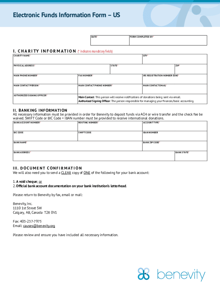 Electronic Funds Information Form US DATE*FORM COMPLETED BY*I . C H A R I T Y I N F O R M A T I O N (* indicates mandatory fields) CHARITY NAME*CITY*PHYSICAL ADDRESS*STATE*ZIP*MAIN PHONE NUMBER*FAX
