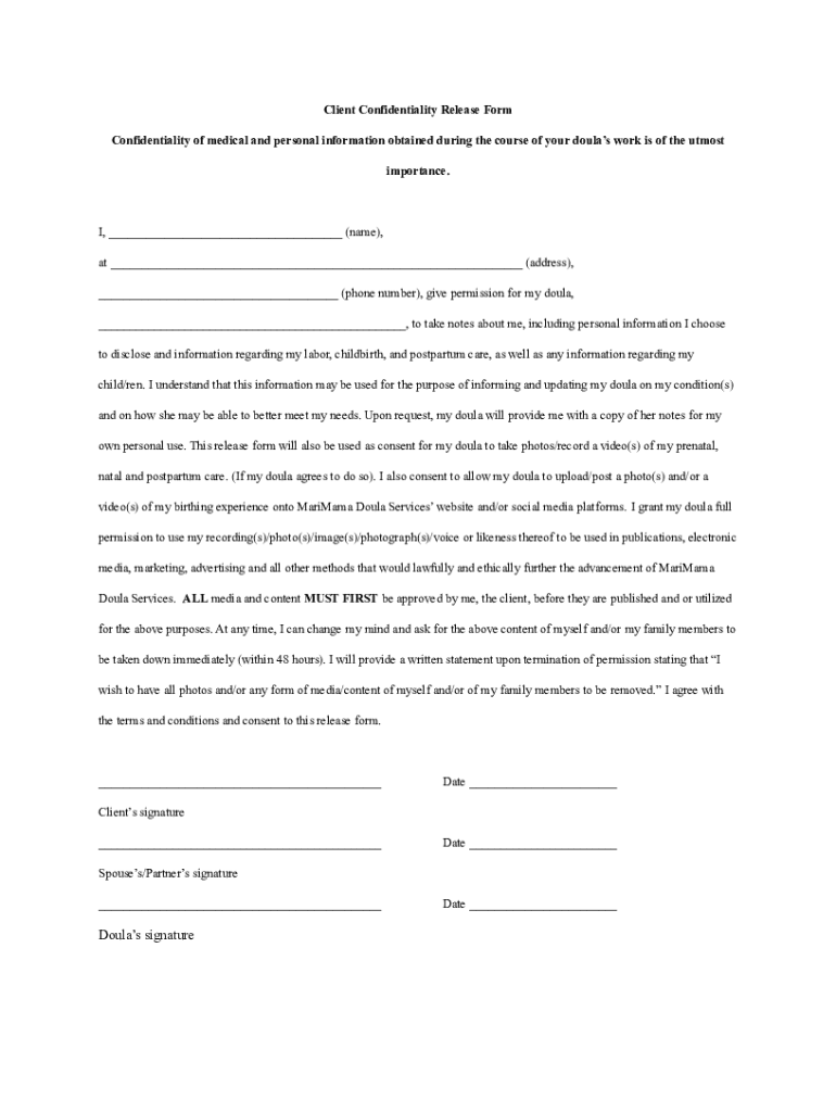 Get the free Client Confidentiality Release Form - MariMama Doula Services
