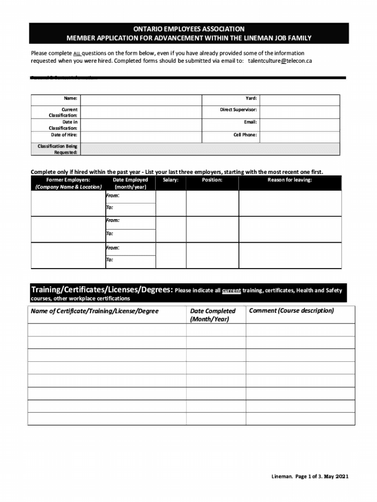 ONTARIO EMPLOYEES ASSOCIATION MEMBER APPLICATION FOR ADVANCEMENT WITHIN THE LINEMAN JOB FAMILY Please complete ALL questions on the form below, even if you have already provided some of the information