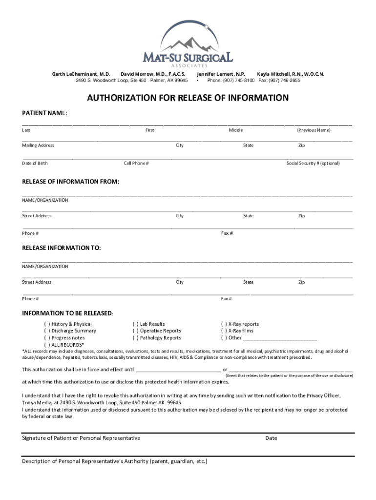 Garth LeCheminant, M.D. David Morrow, M.D., F.A.C.S. 2490 S. Woodworth Loop, Ste 450 Palmer, AK 99645Jennifer Lemert, N.P. Kayla Mitchell, R.N., W.O.C.N. Phone: (907) 7458100 Fax: (907) 7462655AUTHORIZATION