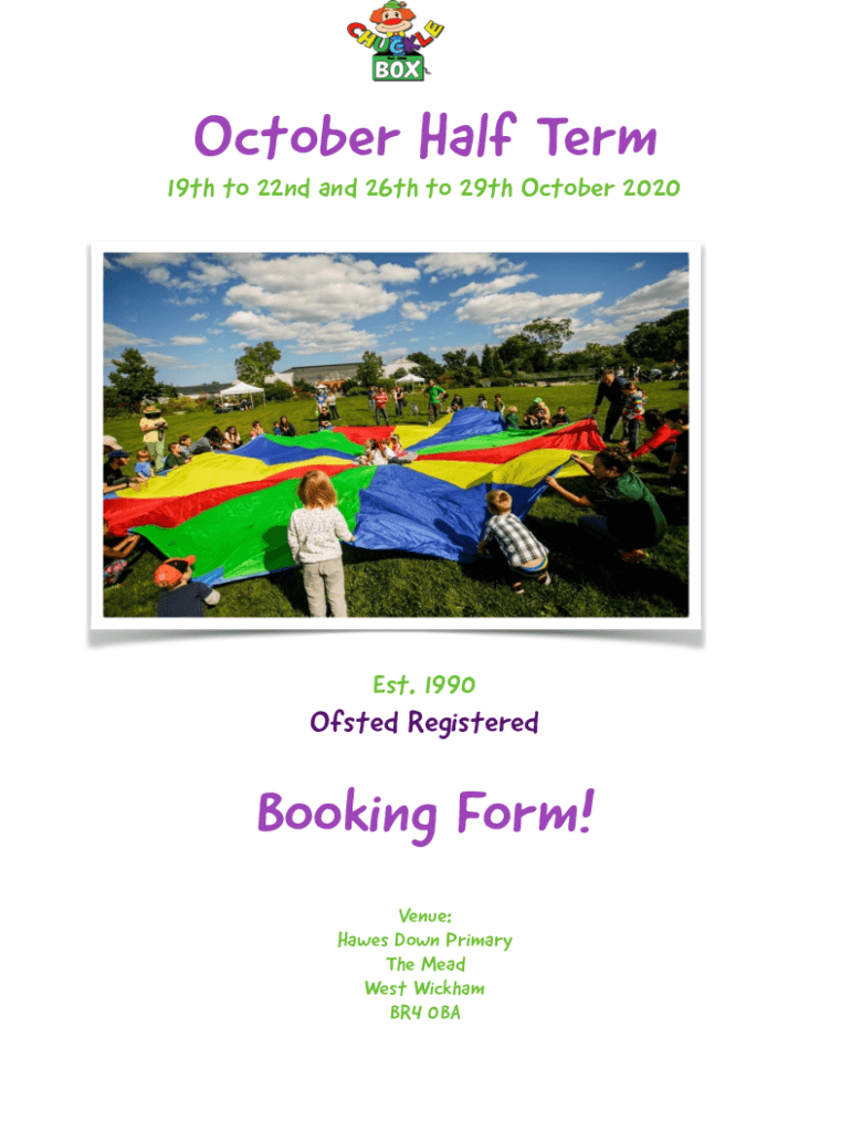 October Half Term 19th to 22nd and 26th to 29th October 2020Est. 1990Ofsted RegisteredBooking Form! Venue: Hawes Down Primary The Mead West Wickham BR4 0BAHoliday Club Information for Parents and