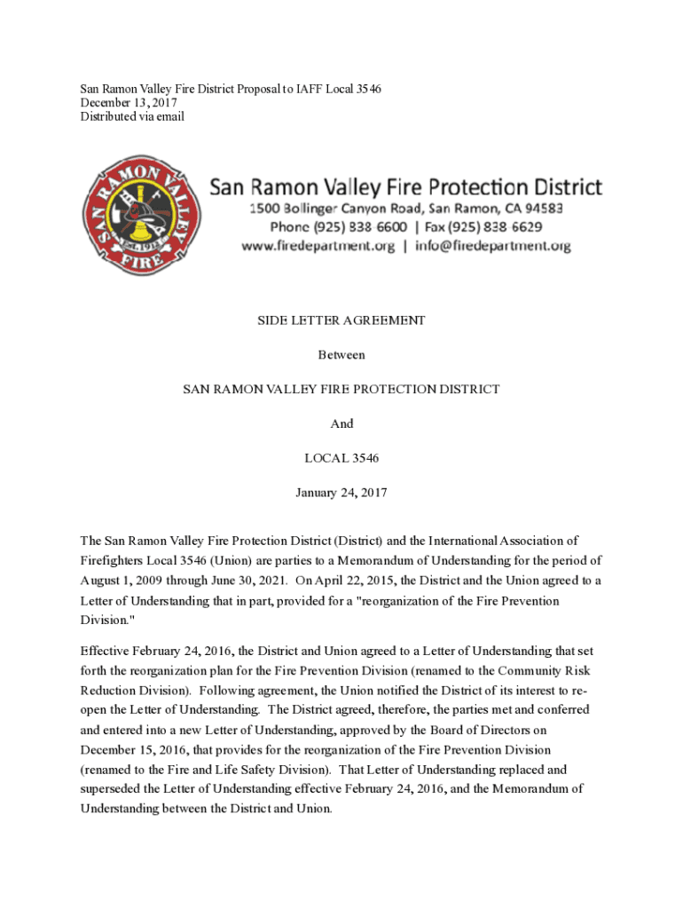 San Ramon Valley Fire District Proposal to IAFF Local 3546 December 13, 2017 Distributed via emailSIDE LETTER AGREEMENT Between SAN RAMON VALLEY FIRE PROTECTION DISTRICT And LOCAL 3546 January 24,