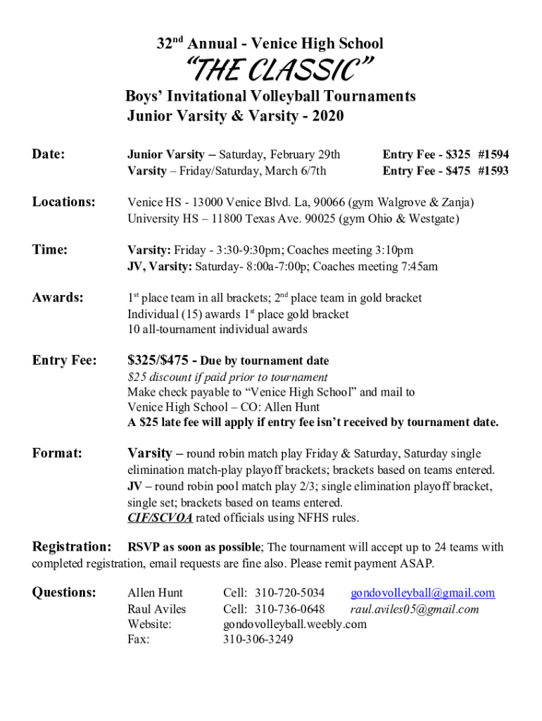 32nd Annual Venice High SchoolTHE CLASSICBoys Invitational Volleyball Tournaments Junior Varsity & Varsity 2020 Date:Junior Varsity Saturday, February 29th Varsity Friday/Saturday, March 6/7thLocations:Venice
