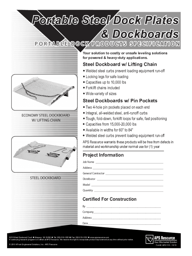 Portable Steel Dock Plates & DockboardsP O R TA B L E D O C K P R O D U C T S S P E C I F I C AT I O N Your solution to costly or unsafe leveling solutions for powered & heavyduty applications.Steel