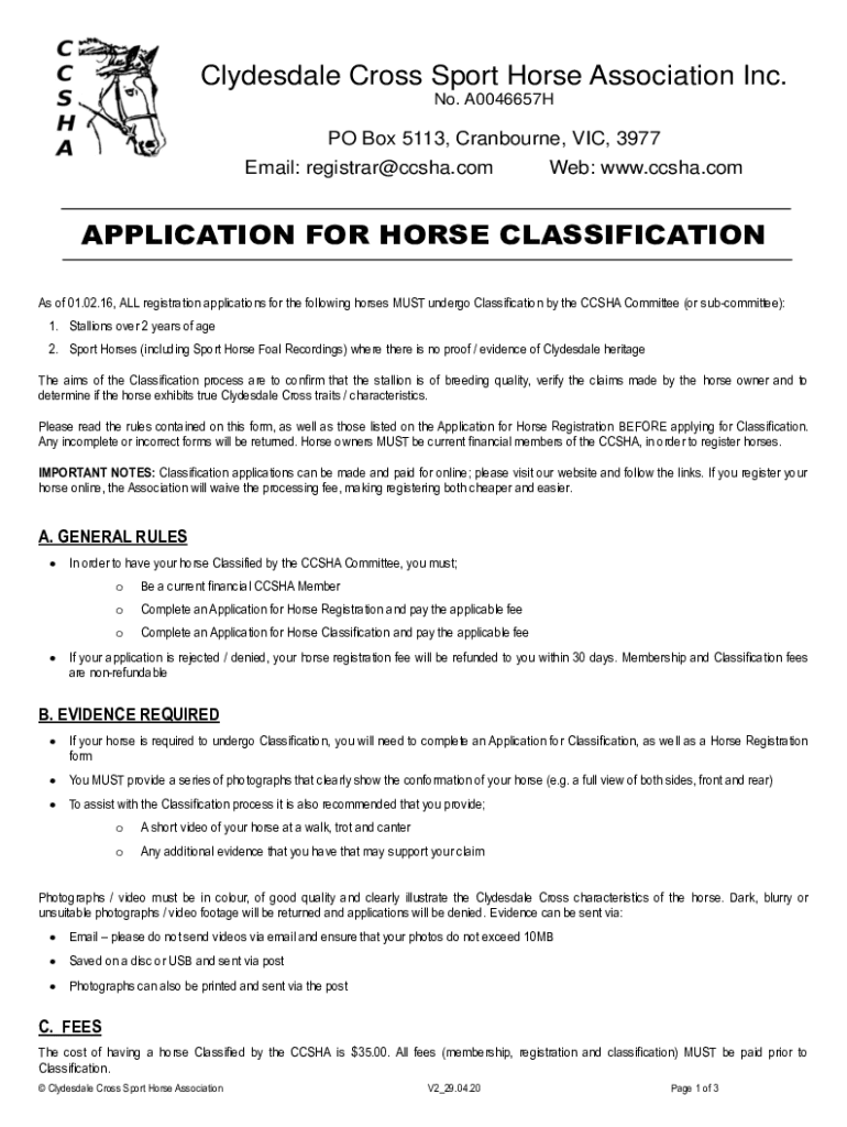Clydesdale Cross Sport Horse Association Inc. No. A0046657HPO Box 5113, Cranbourne, VIC, 3977 Email: registrar@ccsha.comWeb: www.ccsha.comAPPLICATION FOR HORSE CLASSIFICATION As of 01.02.16, ALL registration