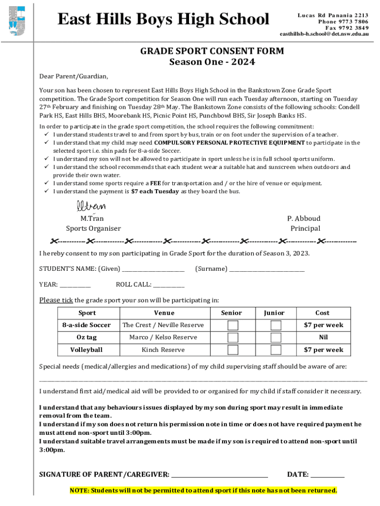 East Hills Boys High SchoolLucas Rd Panania 2213 Phone 9773 7806 Fax 9792 3849 easthillsbh.school@det.nsw.edu.auGRADE SPORT CONSENT FORM Season One 2024 Dear Parent/Guardian, Your son has been chosen