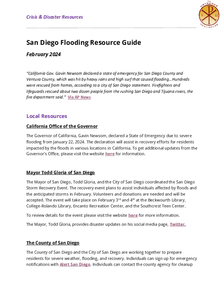 Crisis & Disaster ResourcesSan Diego Flooding Resource Guide February 2024California Gov. Gavin Newsom declared a state of emergency for San Diego County and Ventura County, which was hit by heavy