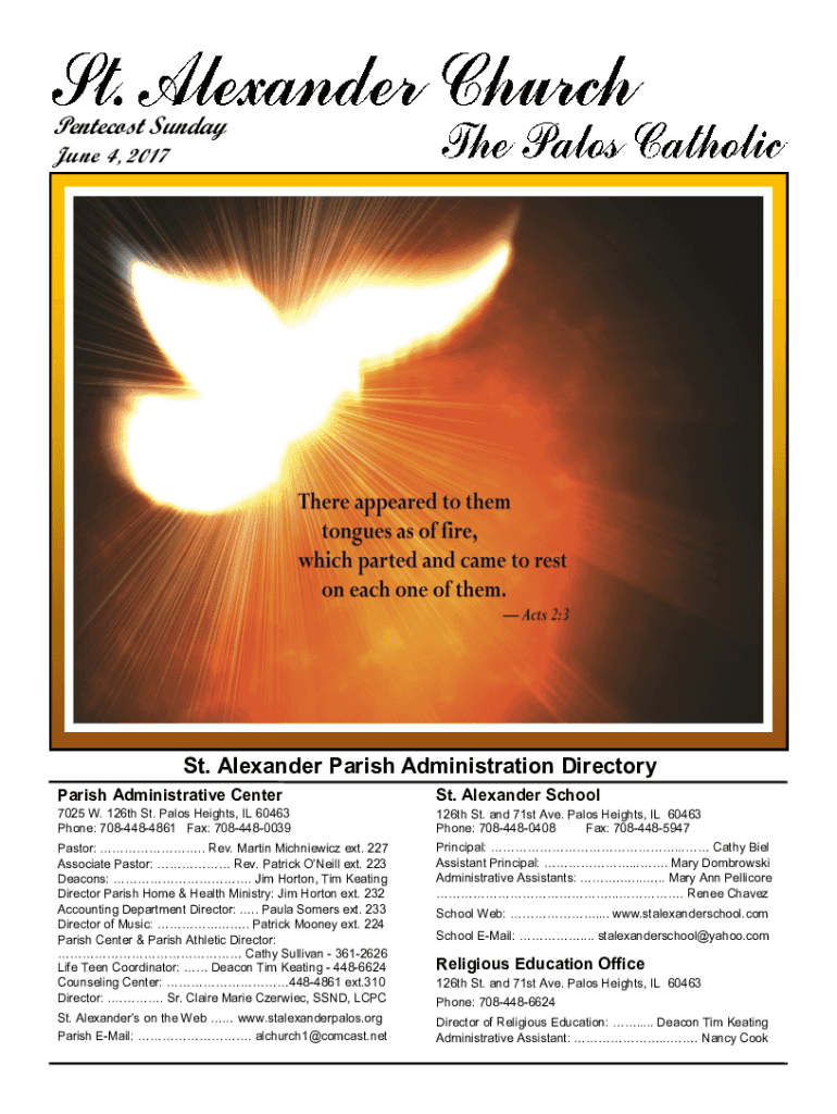 Pentecost Sunday June 4 , 2017St. Alexander Parish Administration Directory Parish Administrative CenterSt. Alexander School7025 W. 126th St. Palos Heights, IL 60463 Phone: 7084484861 Fax: 7084480039126th
