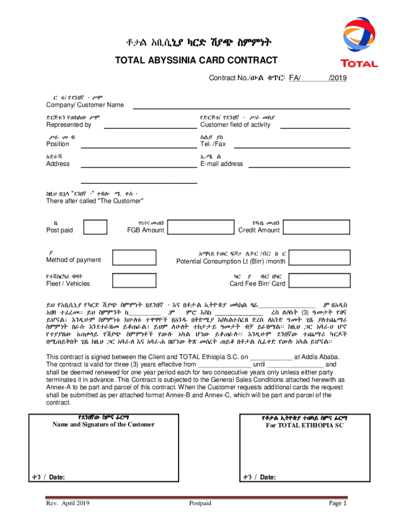 M uc \"` i eUU TOTAL ABYSSINIA CARD CONTRACT Contract No./ FA//2019`/ u YUCompany/ Customer Name ` K YU`/ u Y^ SeRepresented byCustomer field of activityY^ SweM/ePositionTel. /Fax^hT@MAddressEmail