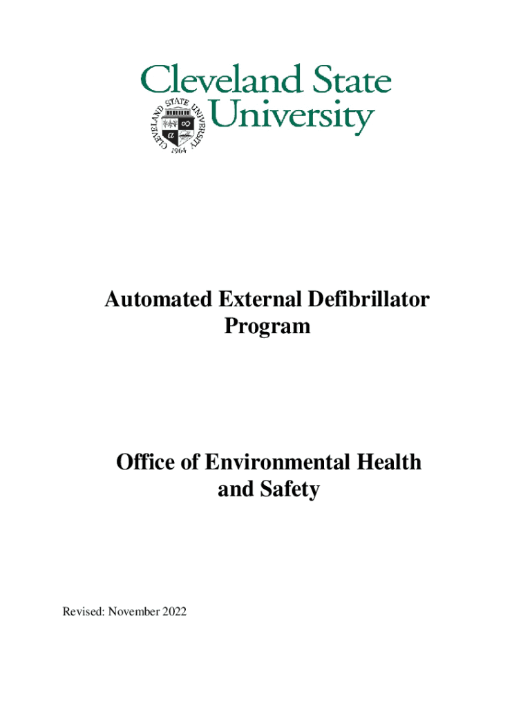 Automated External Defibrillator ProgramOffice of Environmental Health and SafetyRevised: November 2022I. Purpose and Scope This document serves to set forth responsibilities, inspections, recordkeeping,