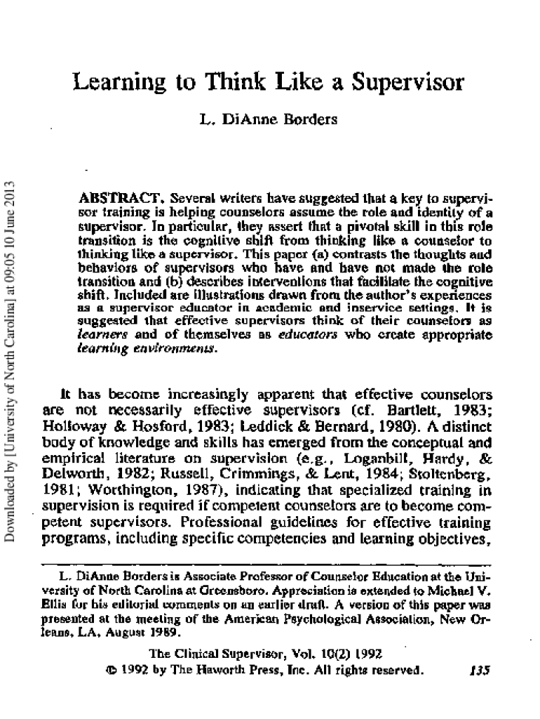 Learning to Think Like a SupervisorDownloaded by [University of North Carolina] at 09:05 10 June 2013L. DiAnne BordersABSTRACT. Several writers have suggested that a key to supervisor training is