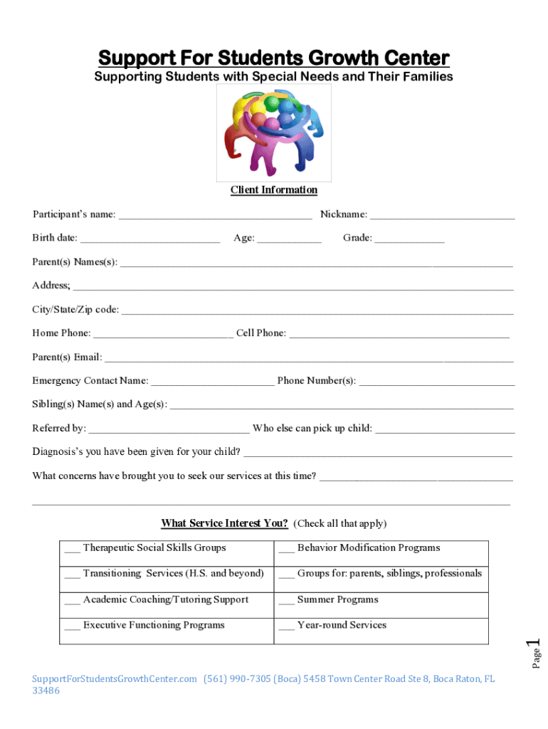 Support For Students Growth CenterSupporting Students with Special Needs and Their FamiliesClient Information Participants name: ___ Nickname: ___ Birth date: ___Age: ___Grade: ___Parent(s) Names(s):