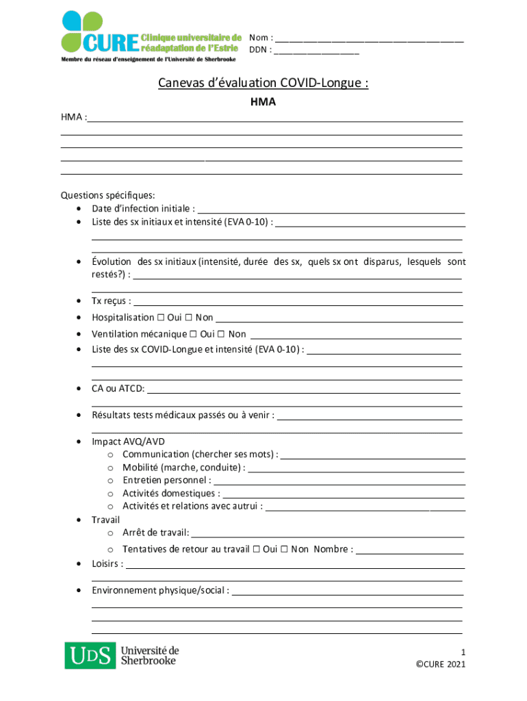Nom : ___ DDN : ___Canevas dvaluation COVIDLongue : HMA HMA :___ ___ ___ ___ ___ Questions spcifiques: Date dinfection initiale : ___ Liste des sx initiaux et intensit (EVA 010) : ___ ___ ___ volution