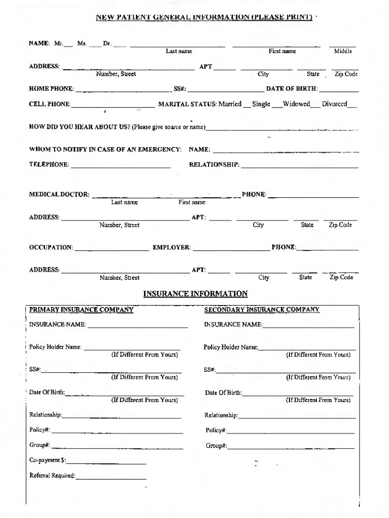 NEW PATIENT GENERAL INFORMATION (PLEASE PRINT) NAME: Mr.Ms.Dr. First nameLast name ADDRESS:MiddleAPT Number, StreetHOME PHONE:StateCityZip CodeDATE OF BIRTH:SS#:MARITAL STATUS: Married ___ Single