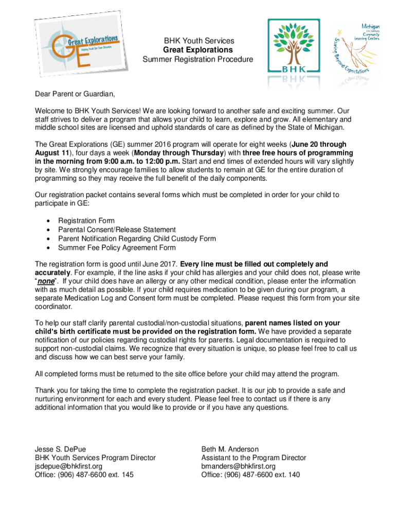 BHK Youth Services Great Explorations Summer Registration ProcedureDear Parent or Guardian, Welcome to BHK Youth Services! We are looking forward to another safe and exciting summer. Our staff strives