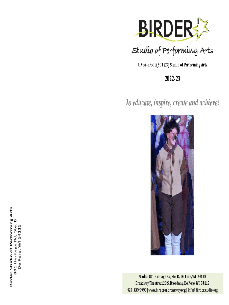 A Nonprofit (5013) Studio of Performing Arts202223To educate, inspire, create and achieve!Studio: 801 Heritage Rd, Ste. B., De Pere, WI 54115 Broadway Theatre: 123 S. Broadway, De Pere, WI 54115 9203399999