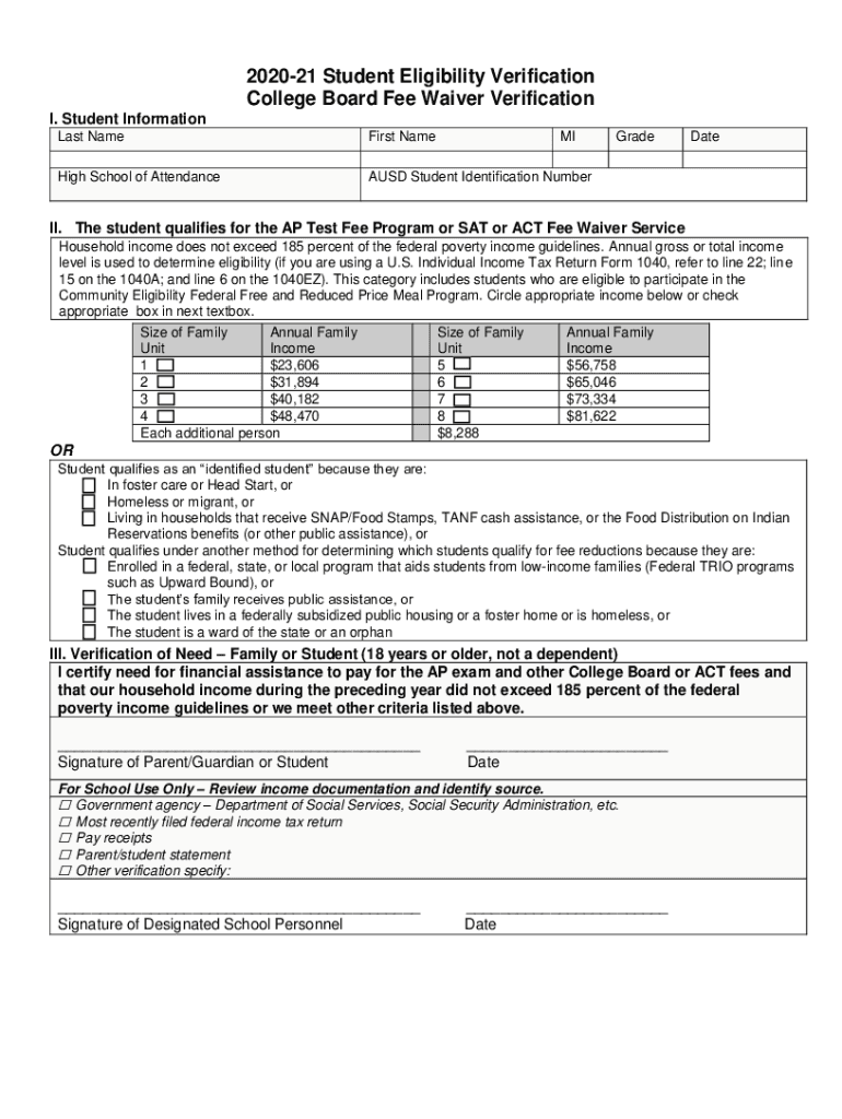 202021 Student Eligibility Verification College Board Fee Waiver Verification I. Student Information Last NameFirst NameMIHigh School of AttendanceAUSD Student Identification NumberGradeDateII. The