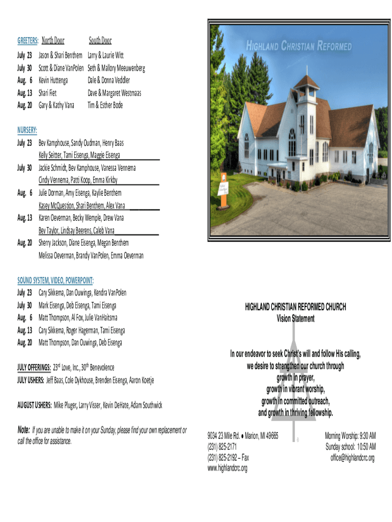 GREETERS: North Door July 23 Jason & Shari Benthem July 30 Scott & Diane VanPolen Aug. 6 Kevin Huttenga Aug. 13 Shari Fiet Aug. 20 Gary & Kathy VanaSouth Door Larry & Laurie Witt Seth & Mallory Meeuwenberg
