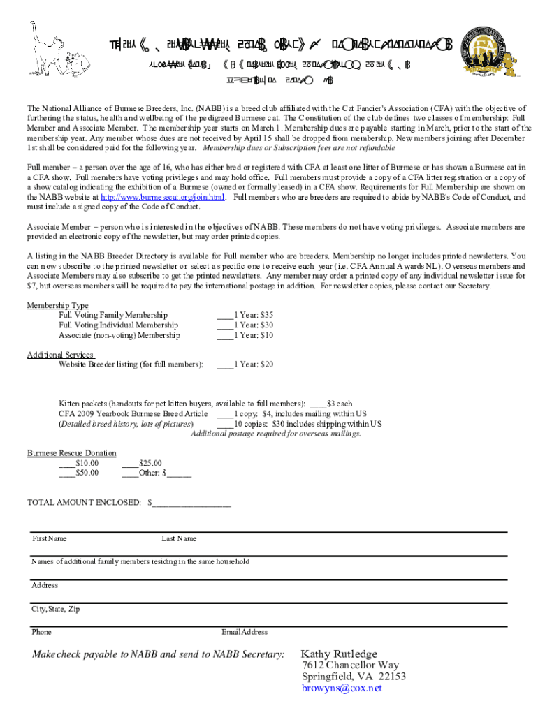 1DWLRQDO$OOLDQFHRI%XUPHVH%UHHGHUV $IILOLDWHGZLWKWKH&DW)DQFLHUV$VVRFLDWLRQ 0HPEHUVKLS The National Alliance of Burmese Breeders, Inc. (NABB) is a breed club affiliated with the Cat Fancier\'s Association