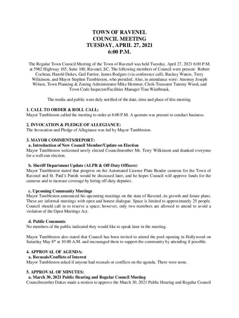 TOWN OF RAVENEL COUNCIL MEETING TUESDAY, APRIL 27, 2021 6:00 P.M. The Regular Town Council Meeting of the Town of Ravenel was held Tuesday, April 27, 2021 6:00 P.M. at 5962 Highway 165, Suite 100,