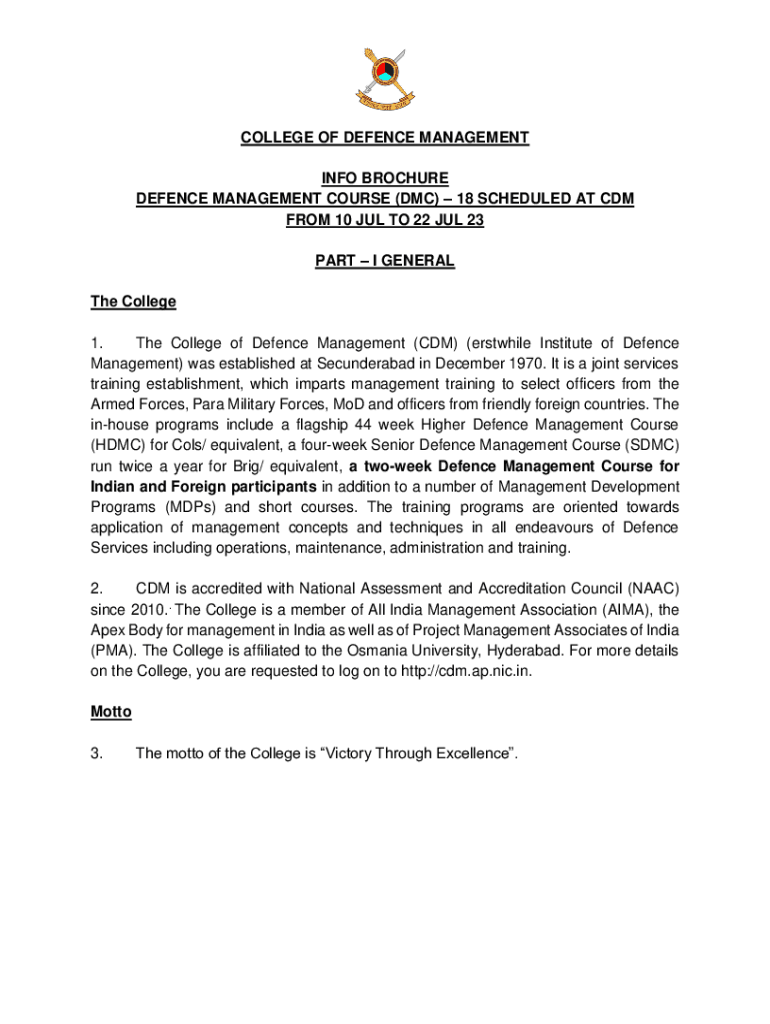 COLLEGE OF DEFENCE MANAGEMENT INFO BROCHURE DEFENCE MANAGEMENT COURSE (DMC) 18 SCHEDULED AT CDM FROM 10 JUL TO 22 JUL 23 PART I GENERAL The College 1. The College of Defence Management (CDM) (erstwhile