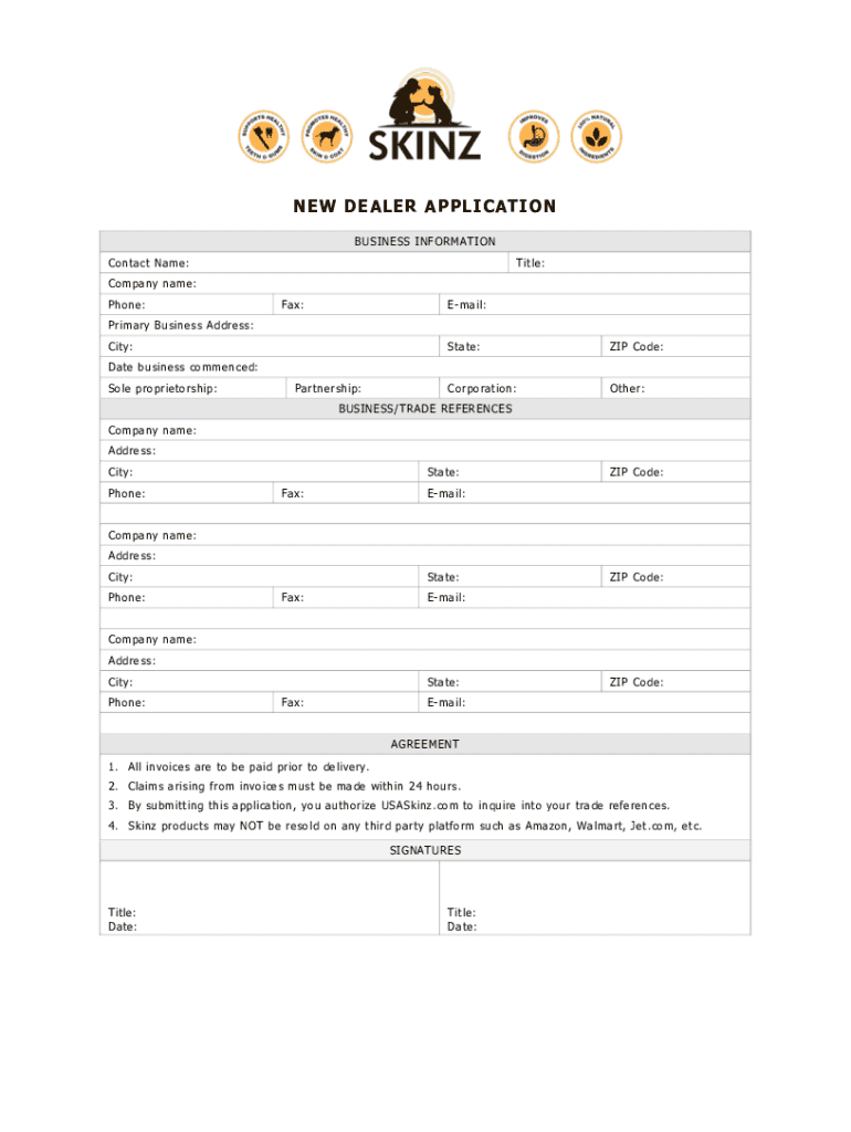 NEW DEALER APPLICATION BUSINESS INFORMATION Contact Name:Title:Company name: Phone:Fax:Email:Primary Business Address: City:State:ZIP Code:Corporation:Other:Date business commenced: Sole proprietorship:Partnership:BUSINESS/TRADE