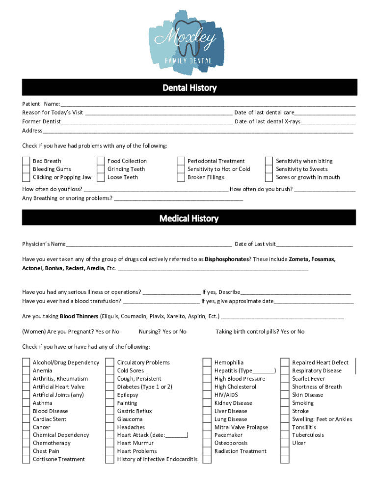 Patient Name:___ Reason for Todays Visit ___ Date of last dental care___ Former Dentist___ Date of last dental Xrays___ Address___ Check if you have had problems with any of the following: Bad Breath