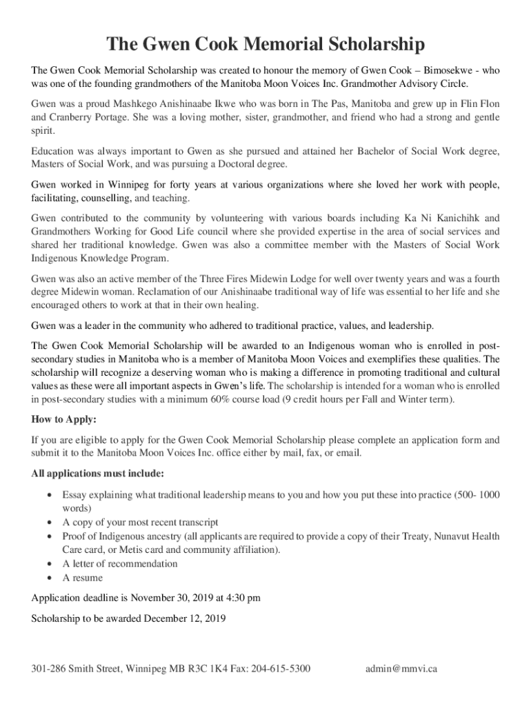 The Gwen Cook Memorial Scholarship The Gwen Cook Memorial Scholarship was created to honour the memory of Gwen Cook Bimosekwe who was one of the founding grandmothers of the Manitoba Moon Voices Inc.