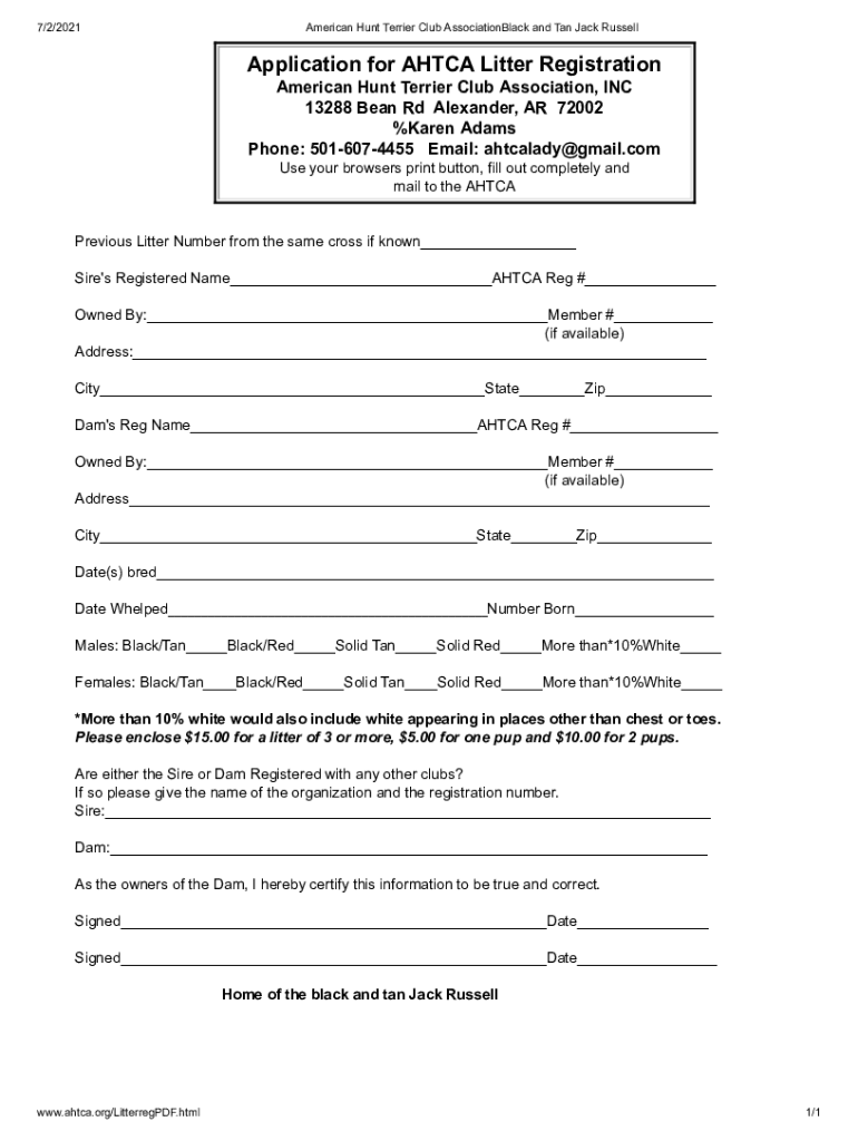 7/2/2021American Hunt Terrier Club AssociationBlack and Tan Jack RussellApplication for AH TCA Litter Registration