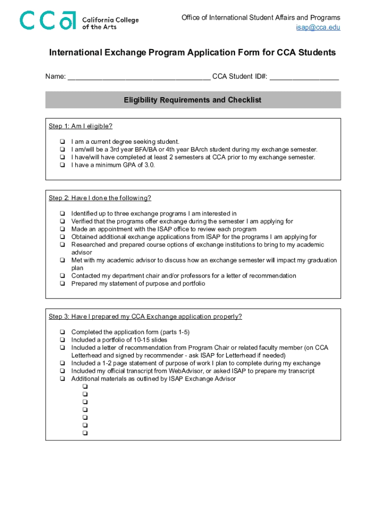 OfficeofInternationalStudentAffairsandPrograms isap@cca.eduInternationalExchangeProgramApplicationFormforCCAStudents Name:___CCAStudentID#:___ EligibilityRequirementsandChecklist Step1:AmIeligible?