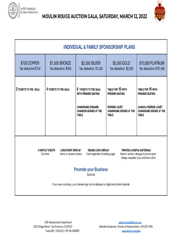 MOULIN ROUGE AUCTION GALA, SATURDAY, MARCH 12, 2022INDIVIDUAL & FAMILY SPONSORSHIP PLANS $700 COPPERTax deduction $1502 TICKETS TO THEGALA$1,500 BRONZE$2,500 SILVERTax deduction $5504 TICKETS TO THE