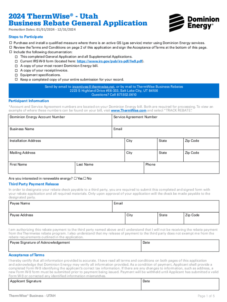 2024 ThermWise Utah Business Rebate General Application Promotion Dates: 01/01/2024 12/31/2024 Steps to Participate Purchase and install a qualified measure where there is an active GS (gas service)