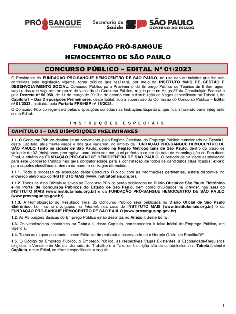 FUNDAO PRSANGUE HEMOCENTRO DE SO PAULO CONCURSO PBLICO EDITAL N 01/2023 O Presidente do FUNDAO PRSANGUE HEMOCENTRO DE SO PAULO, no uso das atribuies que lhe so conferidas pela legislao vigente, torna