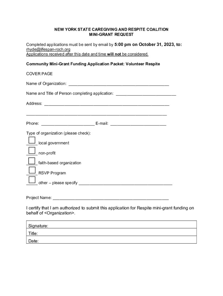Request for Applications (RFA) Community MiniGrant Funding Application Packet New York State Caregiving and Respite Coalition Volunteer Respite Programs Issue Date: October 2, 2023 Application Due