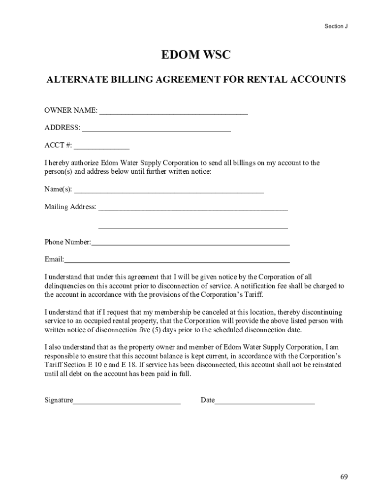 Section JEDOM WSC ALTERNATE BILLING AGREEMENT FOR RENTAL ACCOUNTS OWNER NAME: ___ ADDRESS: ___ ACCT #: ___ I hereby authorize Edom Water Supply Corporation to send all billings on my account to the