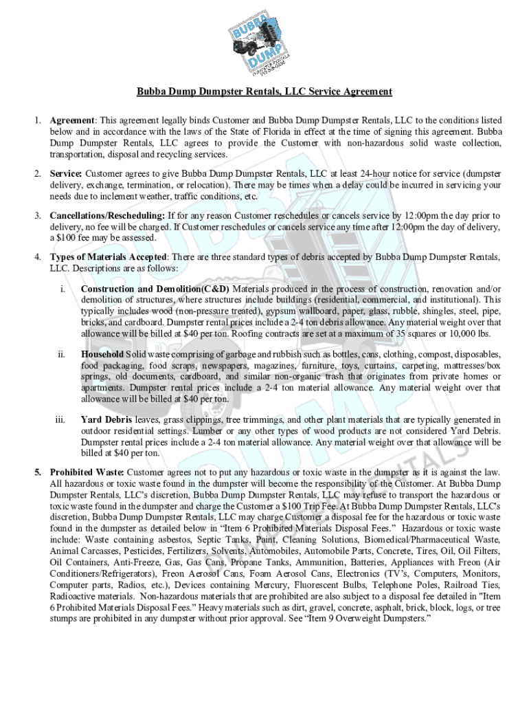 Bubba Dump Dumpster Rentals, LLC Service Agreement 1. Agreement: This agreement legally binds Customer and Bubba Dump Dumpster Rentals, LLC to the conditions listed below and in accordance with the