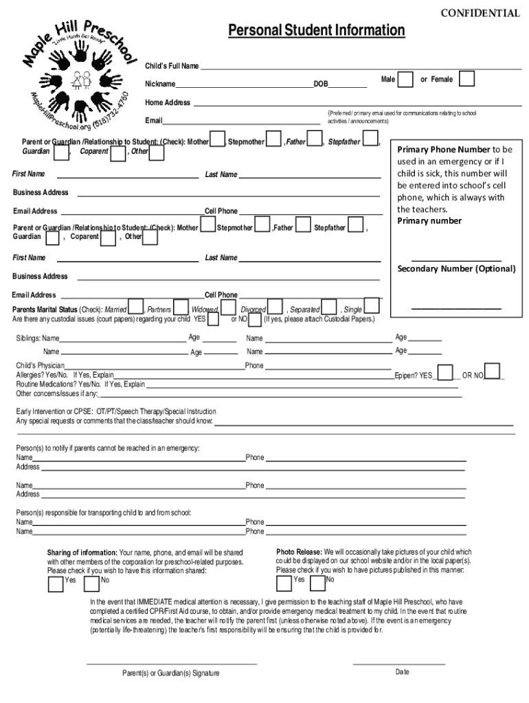 Personal Student InformationCONFIDENTIALChilds Full Name NicknameMaleDOBHome Addressor Female(Preferred/ primary emai used for communications relating to schoolEmailactivities / announcements)Parent