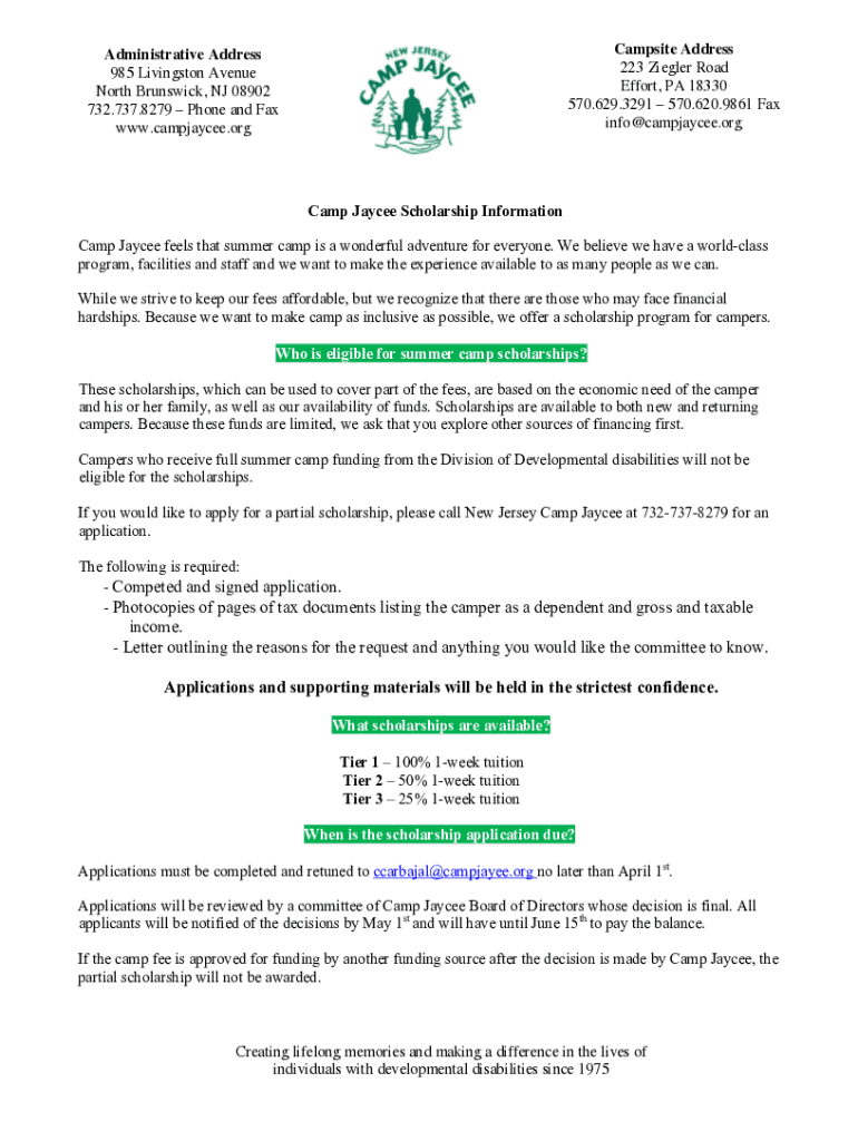 To fill out the New Jersey Camp Jaycee application, gather all relevant information such as participant details, camp location, and program specifics. Complete the required forms accurately and submit them as per the guidelines provided by the camp administration.