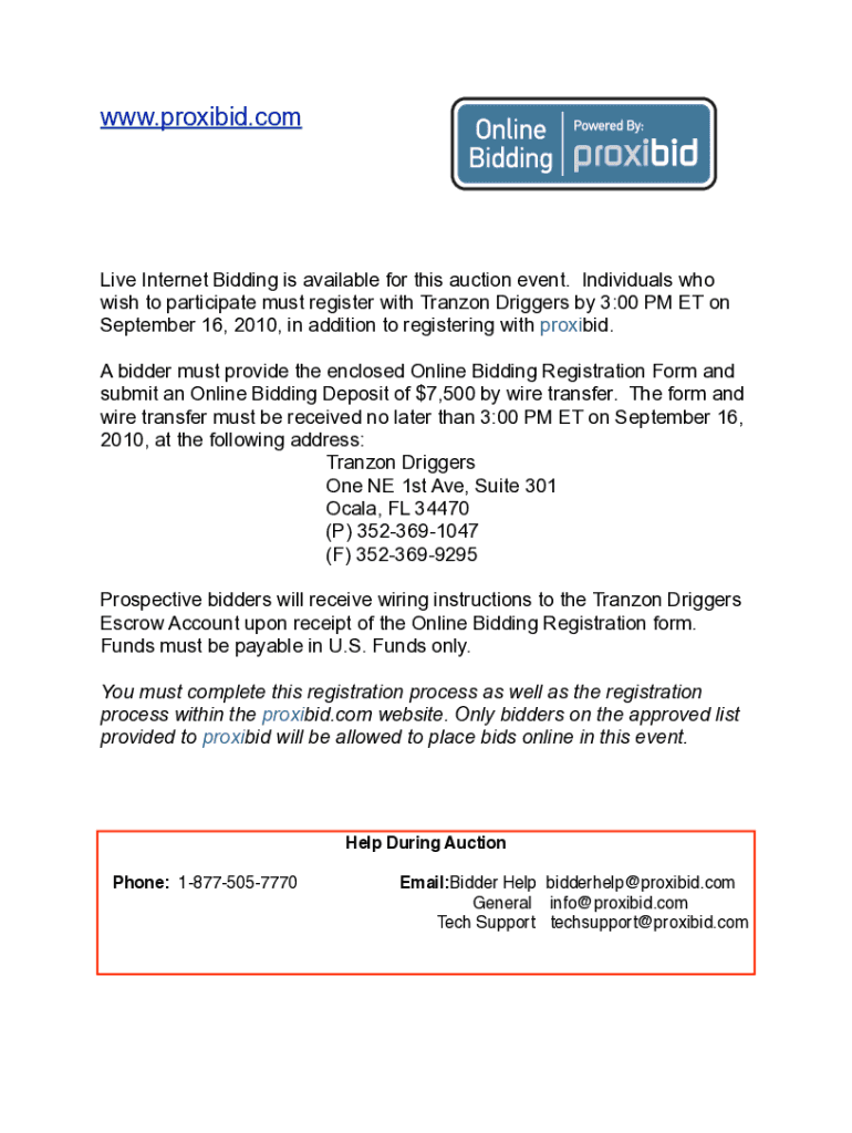 The tranzon auction properties absentee form typically requires the bidder's name, contact information, property of interest, and maximum bid amount.