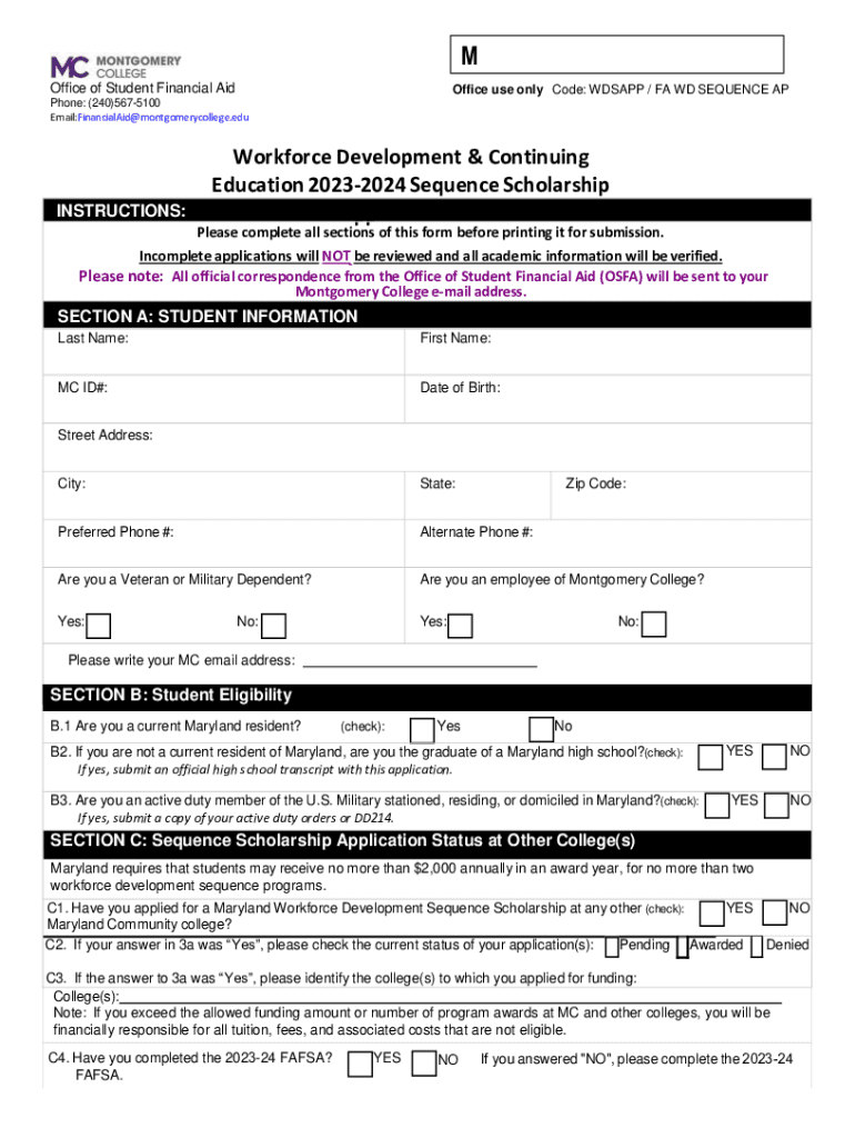 M Office of Student Financial AidOffice use only Code: WDSAPP / FA WD SEQUENCE APPhone: (240)5675100 Email:FinancialAid@montgomerycollege.eduINSTRUCTIONS:Workforce Development & Continuing Education