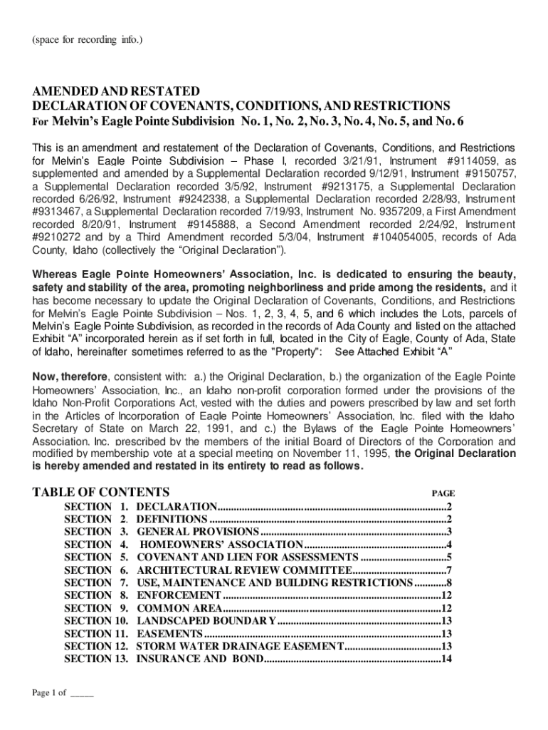 (space for recording info.)AMENDED AND RESTATED DECLARATION OF COVENANTS, CONDITIONS, AND RESTRICTIONS For Melvins Eagle Pointe Subdivision No. 1, No. 2, No. 3, No. 4, No. 5, and No. 6 This is an